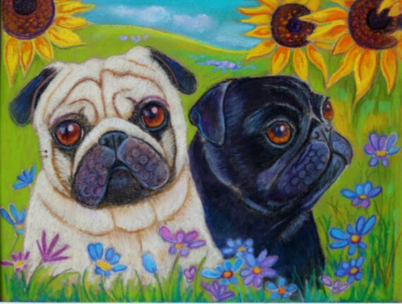 Fawn Pug Art Black Pug Blue Daisies Wildflowers Sunflowers Etsy Uk